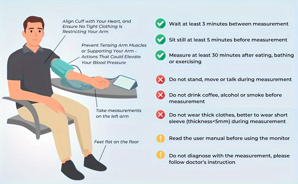 Rechargeable & Accurate: After press the START/STOP button, the device will automatically start to broadcast, preset the cuff pressure and take the measurement.