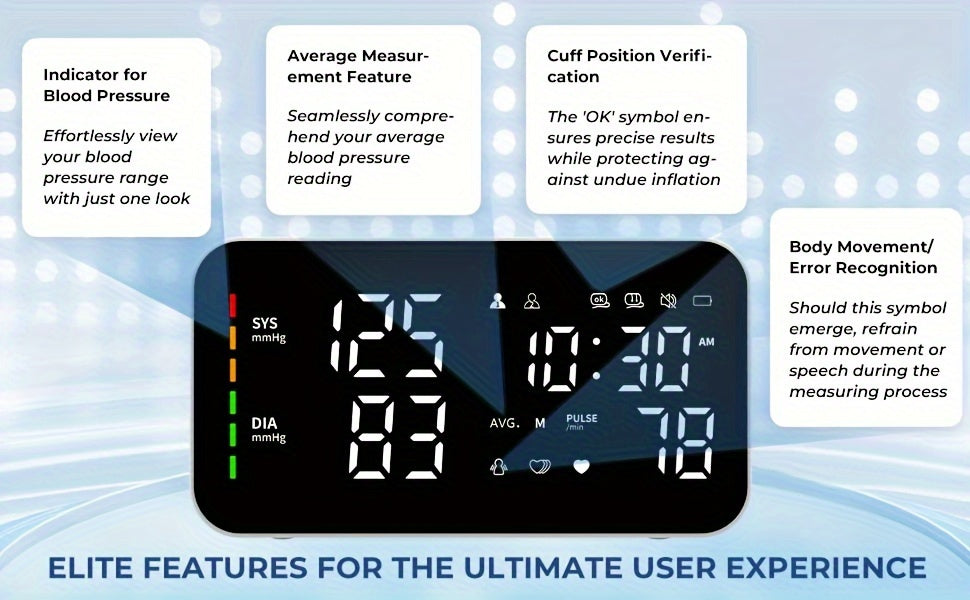 Features: Big Screen;One-piece;Intelligent Pressurization;Voice Broadcast;Irregular Heartbeat Reminder